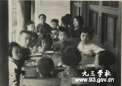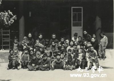 九三學社舊址是一個兩進的院落。從朝北的大門進去以后,左手邊的北院是一排四間平房,這里是社中央宣傳部和組織部辦公的地方。向里面走,經過左手邊的收發室以后,向左轉就進入了南院。若從收發室一直走是一個夾道,夾道的右手邊是一棟坐西朝東的兩層小樓,這是當年社北京分社(1988年社北京市第七次代表大會始更名為社北京市委)辦公的地方。南院的北屋有三間房,是社中央領導的辦公室。西屋和東屋各三間,是社中央辦公廳的辦公室和圖書室。三間南屋是會議室。照片上這么多兒童,他們是誰家的孩子?他們在社中央領導的辦公室外面干什么呢?