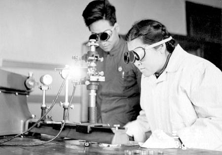 1952年10月,葛庭燧夫婦響應建設東北重工業基地的號召,舉家離開清華園,來到沈陽,參與籌建中國科學院金屬研究所。圖為何怡貞在金屬研究所做光譜實驗(左為張功抒)。