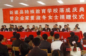儀式上,董淑冬女士向新建縣特殊教育學校捐贈了30萬元人民幣,特殊學校回贈了“關(guān)愛殘兒,情系特教”的銅匾。中共新建縣委副書記劉紅燦致答謝詞。特殊學校校長高美蓮介紹了學校的建設情況。謝麗娟、黃懋衡、董淑冬及當?shù)赜嘘P(guān)領(lǐng)導共同為特殊學校的落成剪彩。